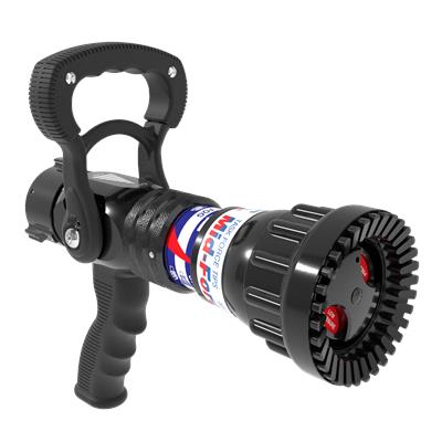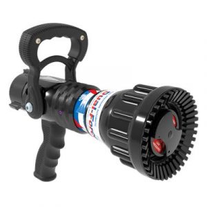 Automatic pressure control with a flow capacity of 70-200 gpm (265-760 l/min). Includes flush without shutting down, patented slide-type valve for turbulence-free flow control, six detent flow positions, and “Gasket Grabber” inlet screen. Lightweight hard coat anodized aluminum for maximum resistance to corrosion and wear. Pistol grip is mounted below the valve. Nozzle may be switched between standard 100 psi (7 bar) and low pressure. 1.5″ NH (38mm) swivel rocker lug coupling is standard.