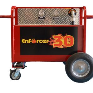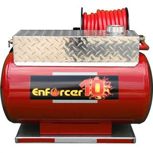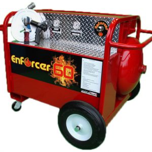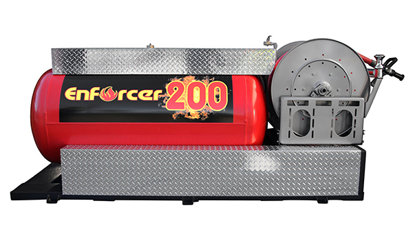 Enforcer maximizes performance of synthetic fluorine free foams and recommends FIREBULL Fluorine Free products. The Enforcer® 200 is a stationary or portable CAF system that contains 200 gallons of foam solution. The Enforcer® 200 CAFS is capable of producing up to 4000 U.S. gallons of finished foam. The Enforcer® 200 produces a foam structure which can stick to horizontal and vertical surfaces thus providing a vapor barrier between the fuel and air. The Enforcer® 200 CAFS has a discharge distance of up to 95 feet with the 1” Booster Line, and 120 feet with the 1 ½” Lay Flat Line. The long discharge distances allow for a safe distance between the system operator and the fire or hazard. Enforcer® products are easy to use, with drastically reduced points where vital components could be broken or tampered with. The Enforcer® 200 CAFS is a versatile firefighting tool with the ability to be adapted to many different risk areas. Features: