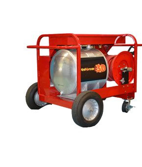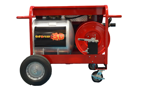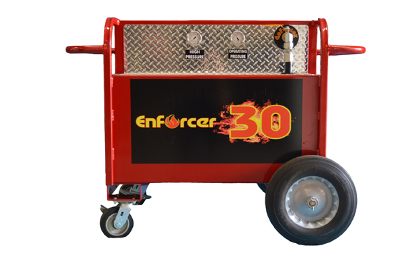 The Enforcer 30 is a portable CAF system that contains 30 gallons of foam solution. The Enforcer 30 portable CAFS is capable of producing up to 600 U.S. gallons of finished foam. The Enforcer 30 produces a foam structure which can stick to horizontal and vertical surfaces thus providing a vapor barrier between the fuel and air. The Enforcer 30 portable CAFS has a discharge distance of up to 45 feet allowing for a safe distance between the system operator and the fire or hazard. Specially designed to maximize performance with FIREBULL Fluorine Free Foams. Enforcer has developed a line of products that are easy to use, as well as drastic reducing points where vital components could be broken or tampered with. The Enforcer 30 is unique in that it comes with a 70 foot hose Reel that will hold 1/2 Inch Diameter Hose. This makes the Enforcer even easier to use. The Enforcer 30 portable CAFS is a versatile firefighting tool with the ability to be adapted to many different risk areas. Enforcer 30 is also available in a wheeled unit as well as a 4500 SCBA. Enforcer 30 has Passed UL 711 10-A & 60-B Fire Testing.